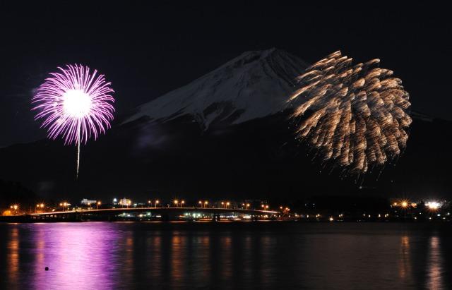 花火は夏のもの。でも富士山は雪があった方がかっこいい。