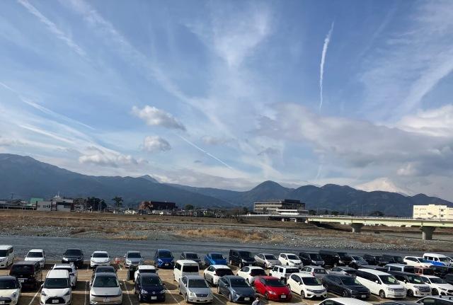 松田町の河津桜を見に行くときの注意です。クルマではダイレクトに公園まで行けません。酒匂川の河原にある臨時駐車場にクルマを置いてシャトルバスで行きます。平日の午前でも多くの人出でバスも混みあっていました。おそらく土日は大変な混雑が予想されます。