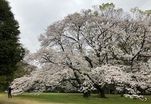 東京の開花宣言が出たので、世田谷区の公園にあるお気に入りの桜を見に来ました。この桜の木は枝が地面に着くほど低く下がっており、枝の下に入ると桜の花に囲まれます。天気は曇り、早朝なので人もまばらで満開の桜を堪能できました。