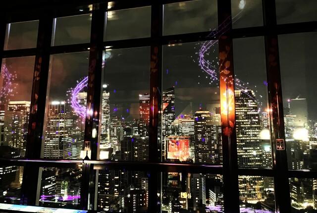窓いっぱいに春をテーマにした映像が、夜景を背景に