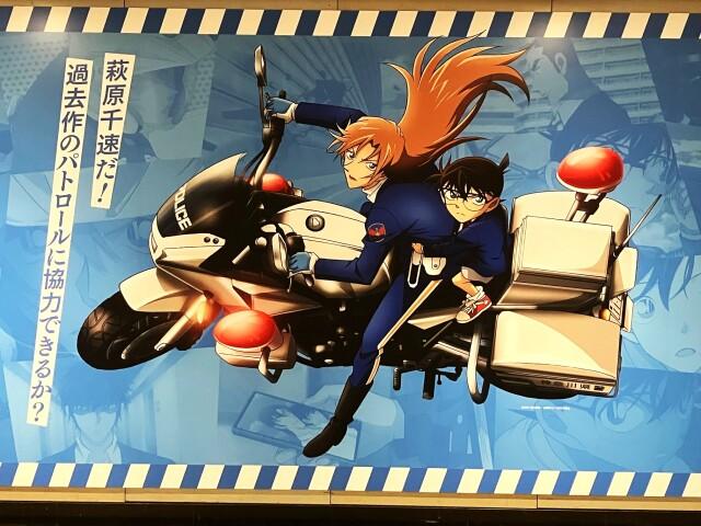 広告ボードにあった、白バイ隊員「萩原千速」とコナンの画像です。大きなサイズで目立っていました。コピーは「萩原千速だ!過去作のパトロールに協力できるか?」と