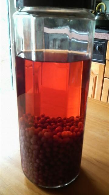 1年間寝かせておいた赤スグリ酒(どぶろくじゃないよ)ですけど、赤の色素もほとんどがアルコール分に溶け出ていたので本日解禁としました、完成です。