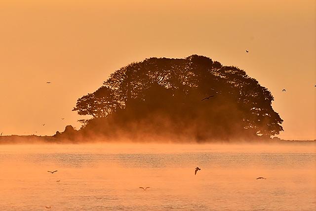 平成28年10月16日(日)の旅の記録。道の駅氷見から眺める、富山湾に立ち込めた朝霧が朝陽に染まった日の出です。