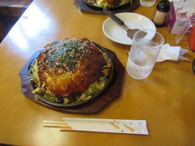 広島のお好み焼きですが、ドーム型に盛り上がっています。キャベツ野菜が中にたっぷりです。熱を通すのに時間がかかります。食べるのにも時間がかかります。千円です。