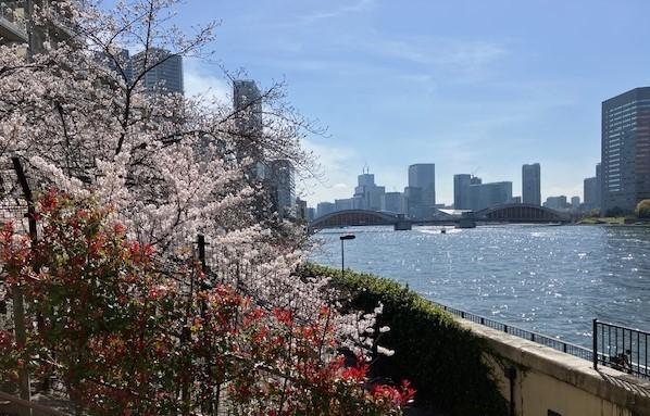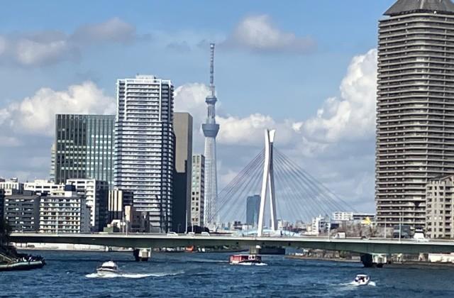 隅田川の写真をもう1点。上流を眺めると、橋の向こうにスカイツリーを見ることができます。川には遊覧船やボートが行きかい、まさに春うららの隅田川です。