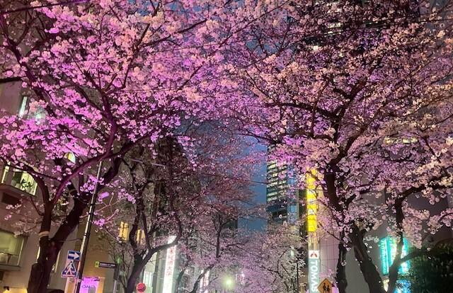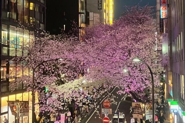 あちこちで桜の情報が聞かれますが、手近なところで渋谷駅東口から徒歩3分の桜坂にライトアップされている桜を見に行きました。写真は坂の上から撮影したものです。
