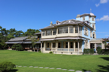 | 桑名市を訪れたら、ぜひ見ておきたいのが、明治・大正期を代表する重要文化財「六華苑」だ。洋館と和館から成る邸宅で、大正2年に実業家・二代諸戸清六の住まいとして完成した。鹿鳴館を手がけたジョサイア・コンドルが設計した洋館では、装飾階段や応接室に、大正期ならではのモダンな息づかいが漂う。劇中では、梓(黒木華)が親友の叶海(藤間爽子)や恋人の澄人(中村蒼)と食事をした「レストランROCCA」から、その淡い水色の外観が印象的に映し出されている。 | ![]() |