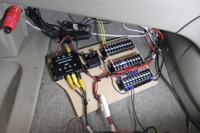 これを機に、リヤモニター3台、ドラレコSRM等の電装品が増えたので配電盤も作成しました。